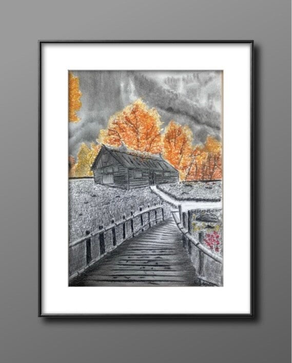 This drawing was created during a quiet moment of reflection. I wanted to capture the feeling of autumn not as a season of fading, but of presence—where color and stillness coexist. The cabin, the trees, the swirling sky—they all speak to a kind of strength that doesn’t need to be loud. “Autumn in Mountains” is part of a series that explores how beauty and dignity can live in contrast, and how nature teaches us to be without asking for approval.