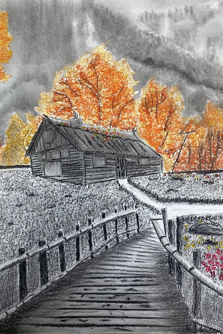 Autumn in Mountains- Charcoal and Soft Pastel Drawing by S.Jensen