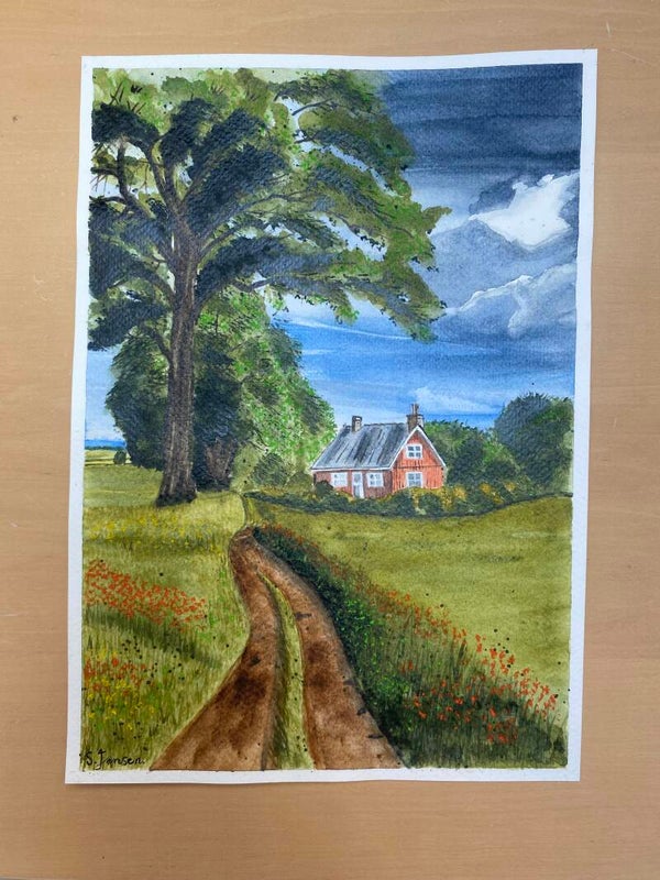 This watercolor painting shows a peaceful countryside scene with a winding dirt path leading to a red-brick house surrounded by green fields and trees. The sky is dramatic, with dark clouds that contrast beautifully with the vibrant landscape. Red flowers add warmth and movement to the scene. The house stands quietly in the distance, offering a sense of calm and solitude.