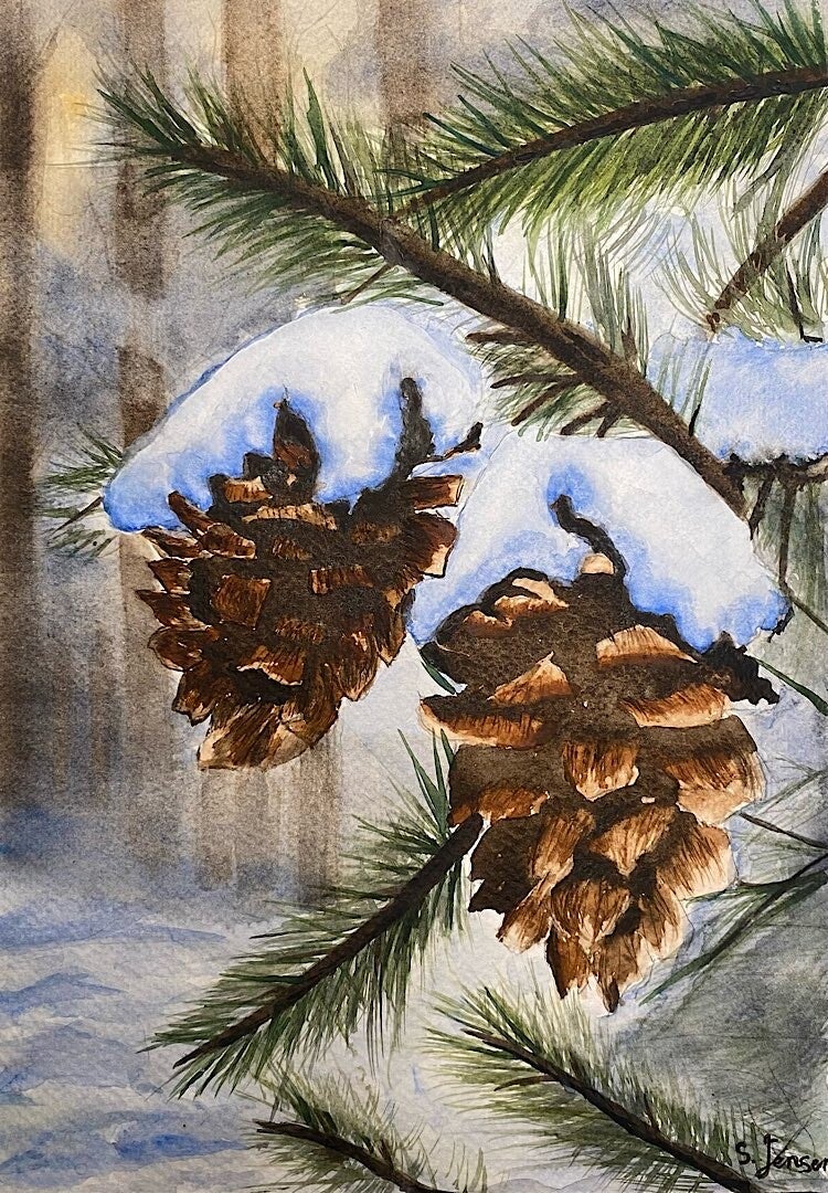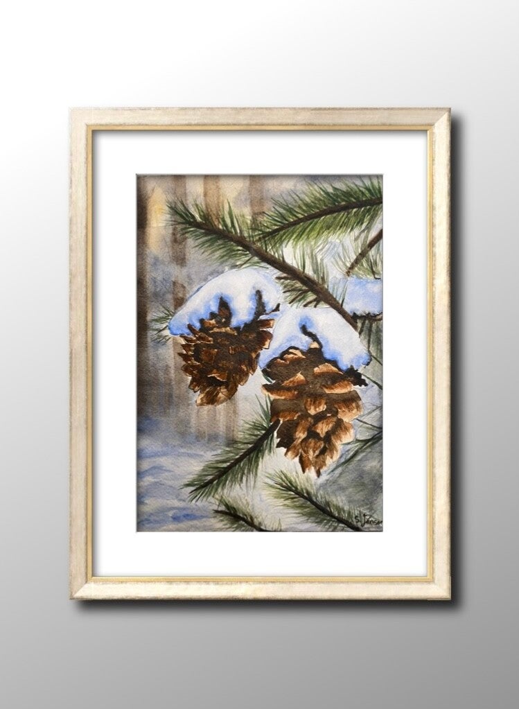 This watercolor painting captures the quiet elegance of winter through the texture of pine cones and the softness of snow.