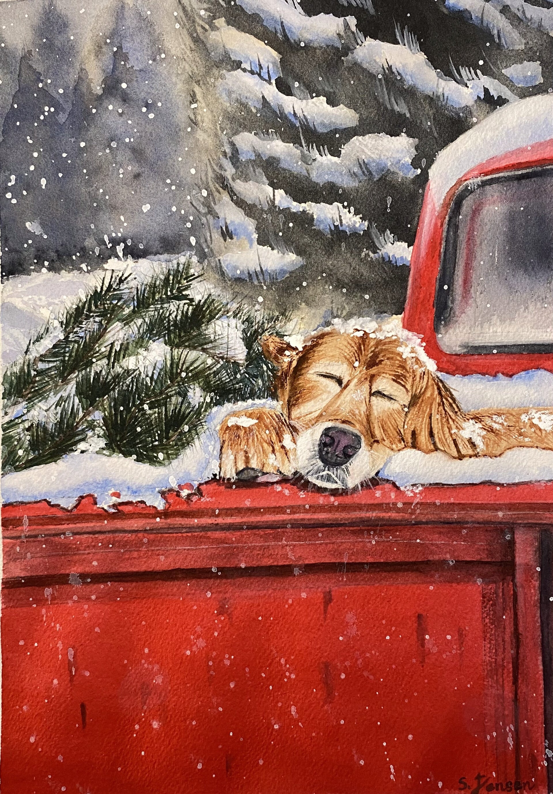 A red truck stands still in the hush of snowfall. In its open bed, a brown dog sleeps peacefully, dusted with snow, nestled among pine branches. The background fades into tall evergreens, silent and white. Nothing moves, yet everything breathes. This is winter’s gentlest witness—a moment of rest, loyalty, and quiet companionship. Signed by S. Jensen, this watercolor is not just an image, but a memory held in silence.