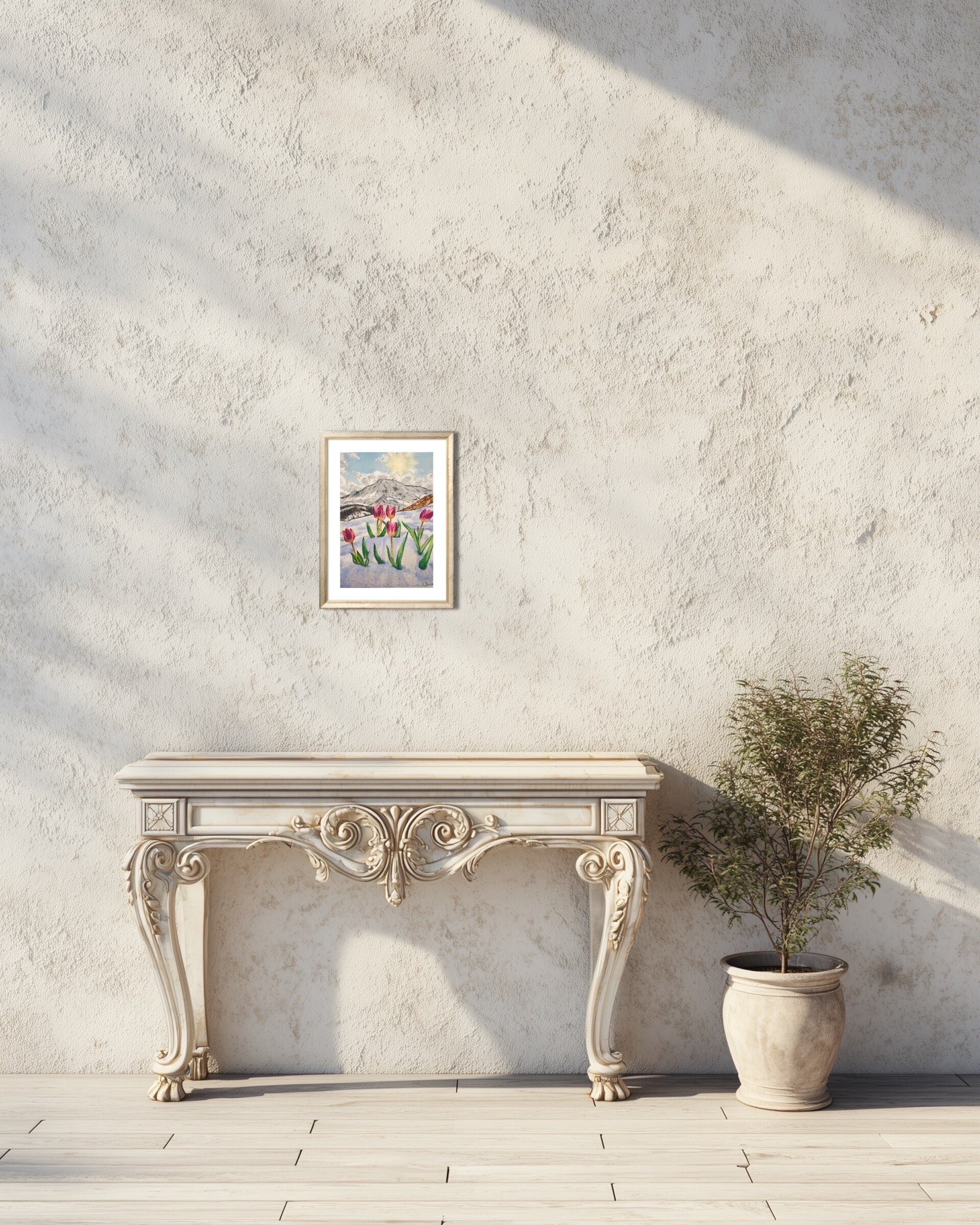 This watercolor captures the delicate tension between winter and spring. The tulips, painted in vibrant pinks, symbolize renewal and resilience as they emerge from snow-covered ground. The mountain backdrop and filtered sunlight evoke a sense of serenity and transition. I aimed to contrast the cold permanence of the mountains with the fleeting beauty of blooming life.