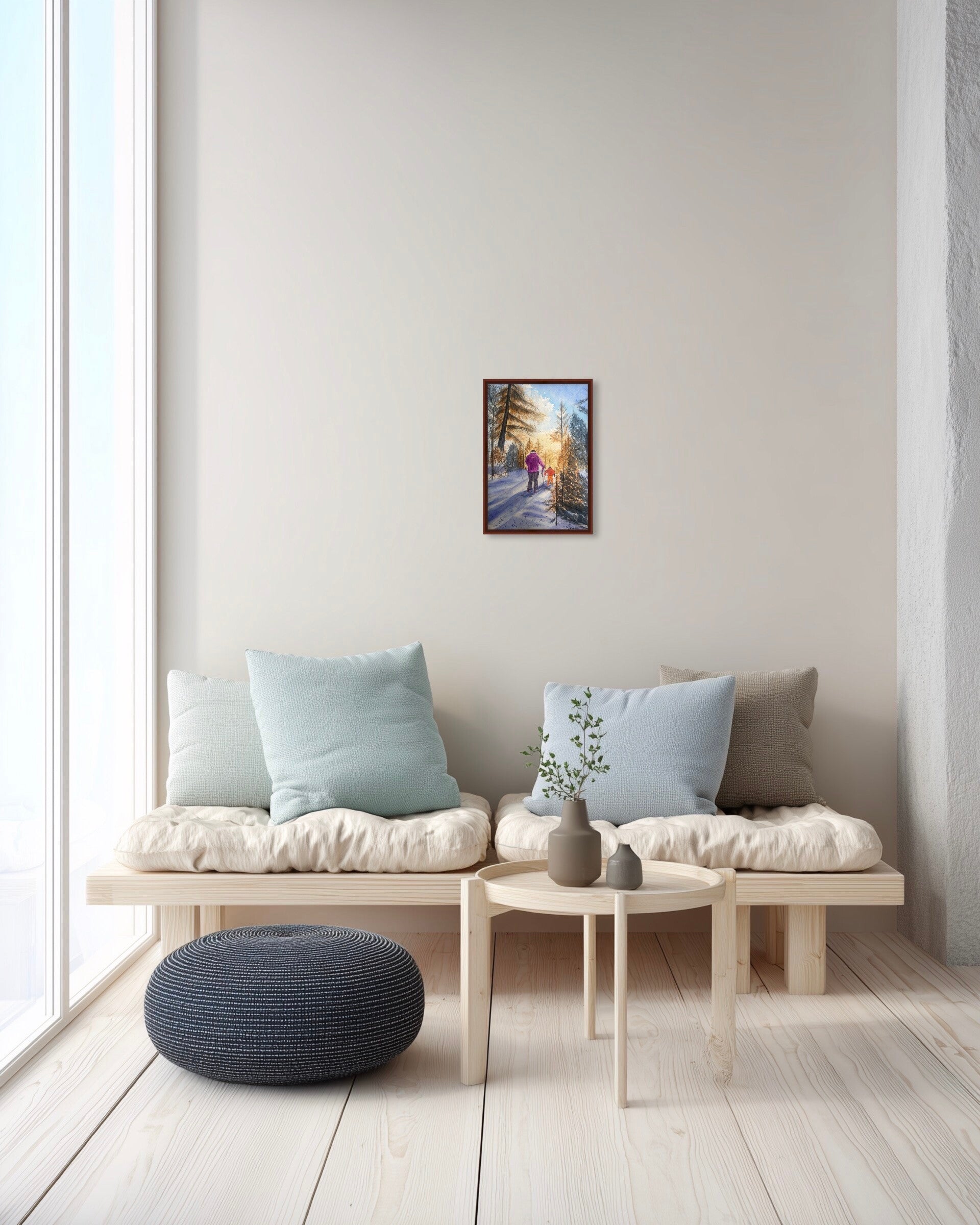 “Ski Vacation” captures the serene thrill of cross-country skiing through a sunlit forest. The artist uses warm tones to contrast the cool snow, creating a harmonious balance between energy and tranquility. The figures, dressed in vibrant winter gear, add a dynamic focal point, while the long shadows and golden light evoke a sense of late afternoon calm. The watercolor technique enhances the softness of the scene, making it feel both nostalgic and alive.