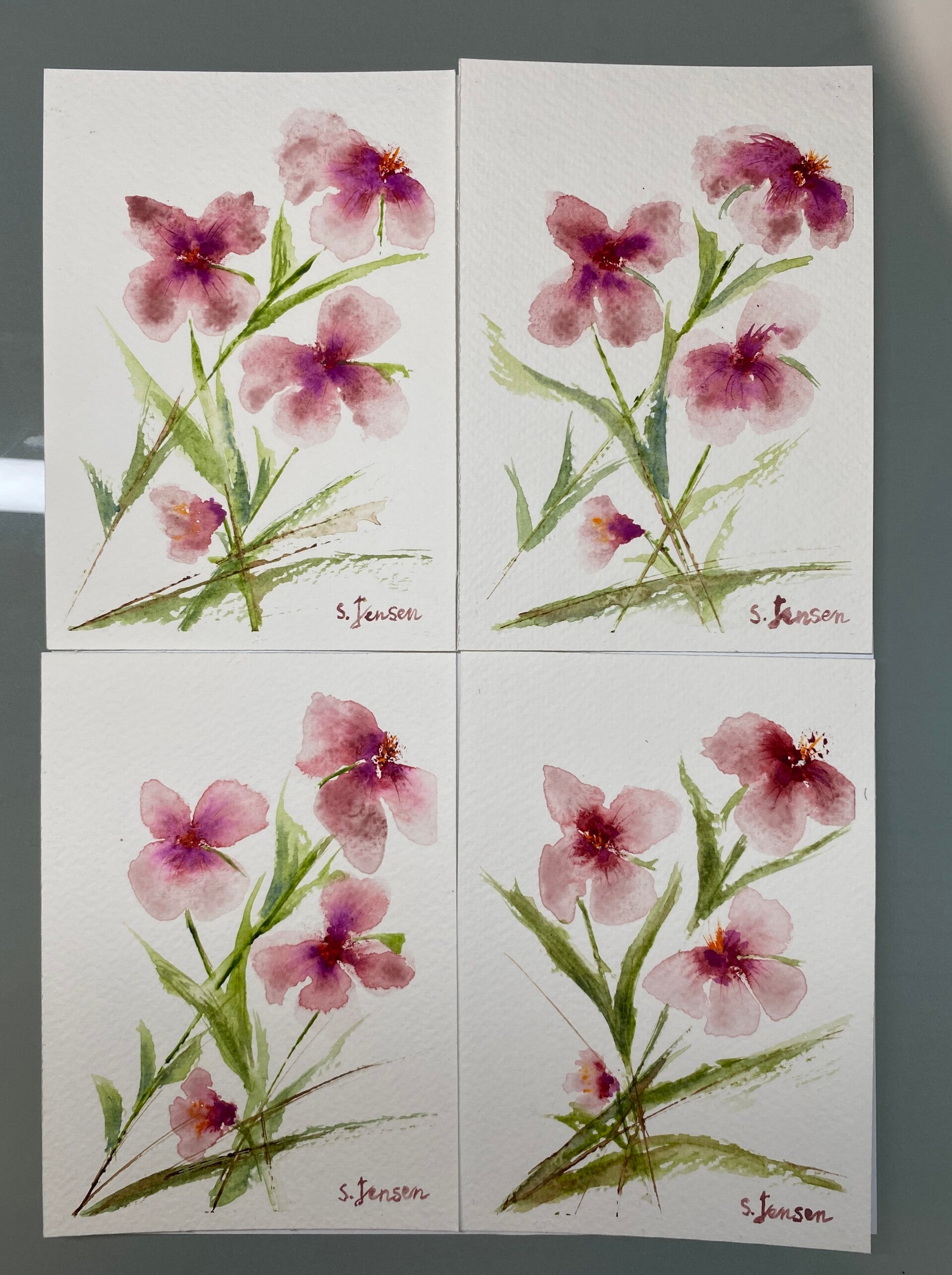 This set includes four handmade watercolor postcards featuring delicate pink and purple floral designs. Each piece is painted with soft brushstrokes, transparent layers, and a minimal, elegant composition that highlights the natural beauty of watercolor.
